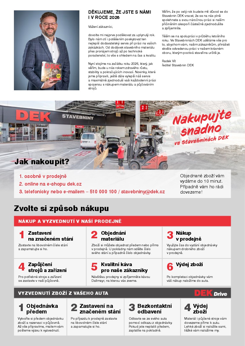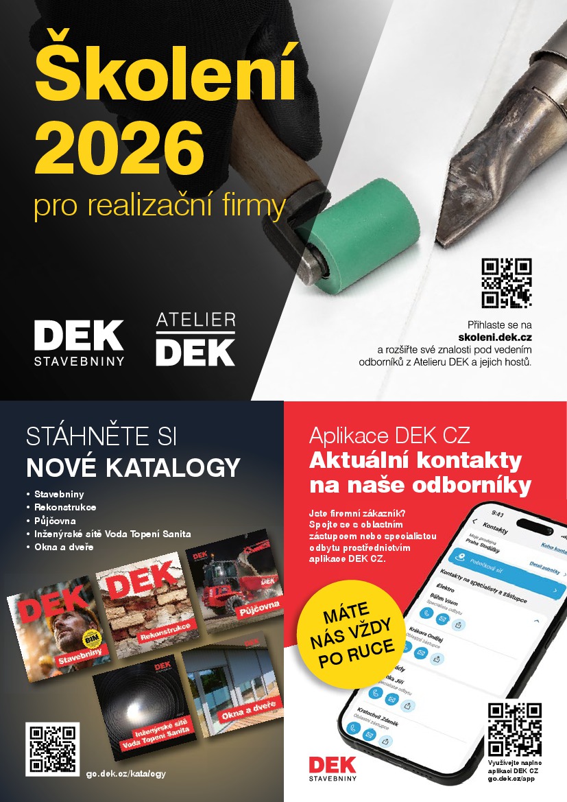 DEK Stavebniny DEK Stavebniny aktuální leták od 03.02.2026 Nabídka letáku platí od 03.02.2026 do 01.03.2026 Leták zde ke stažení v pdf